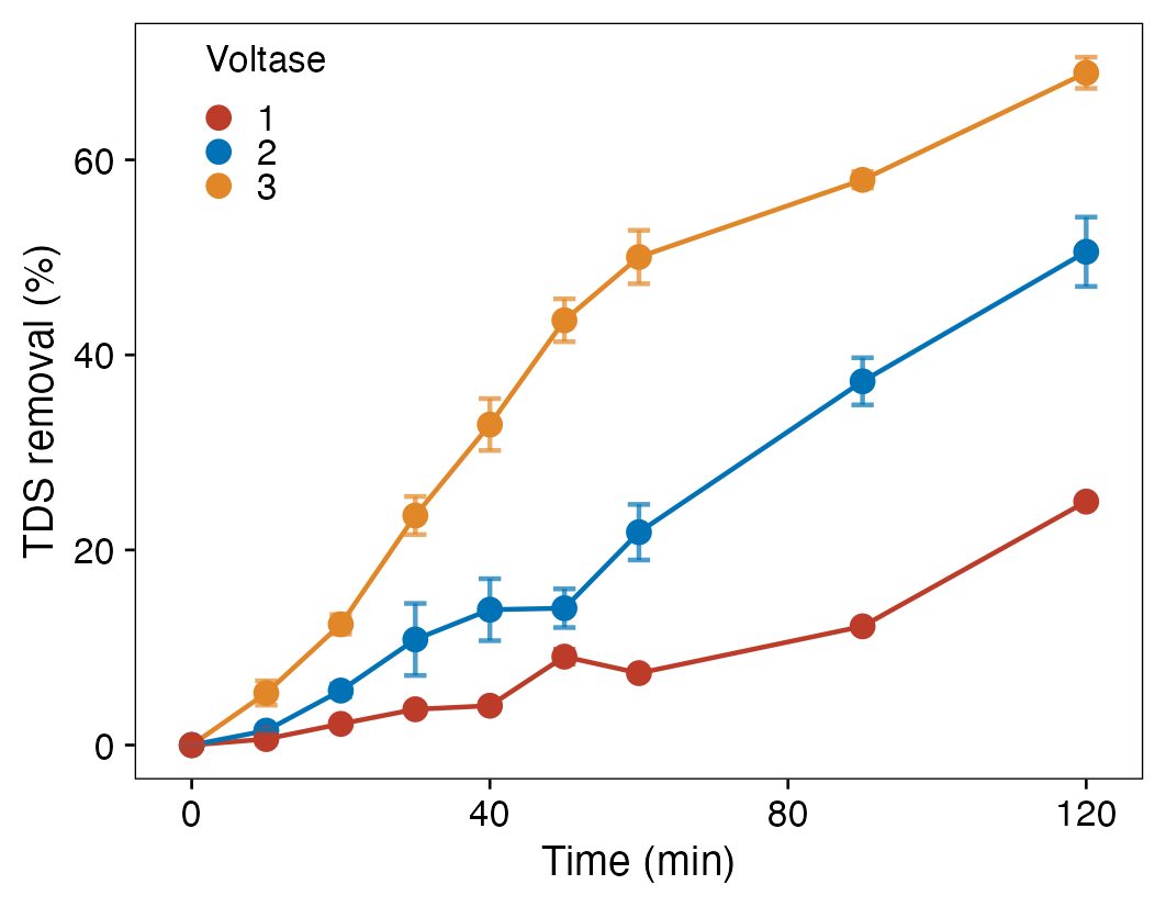 Figure 4 shows TDS removal efficiency over time at different voltages. TDS removal increased with contact time and voltage, indicating improved ionic and colloidal removal at higher current density. At 3 V, removal rose from 0% at 0 min to 32.9% at 40 min and reached 68.9% at 120 min. At 2 V, the increase was more gradual, reaching 21.8% at 60 min and 50.6% at 120 min. The 1 V condition showed limited performance with only 25.0% removal at 120 min, and a small fluctuation around 50–60 min, which is likely within experimental variability. The low standard deviations (typically <4%) support the reproducibility of these trends.
