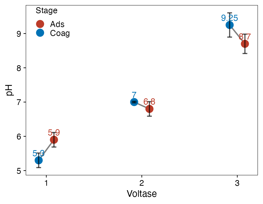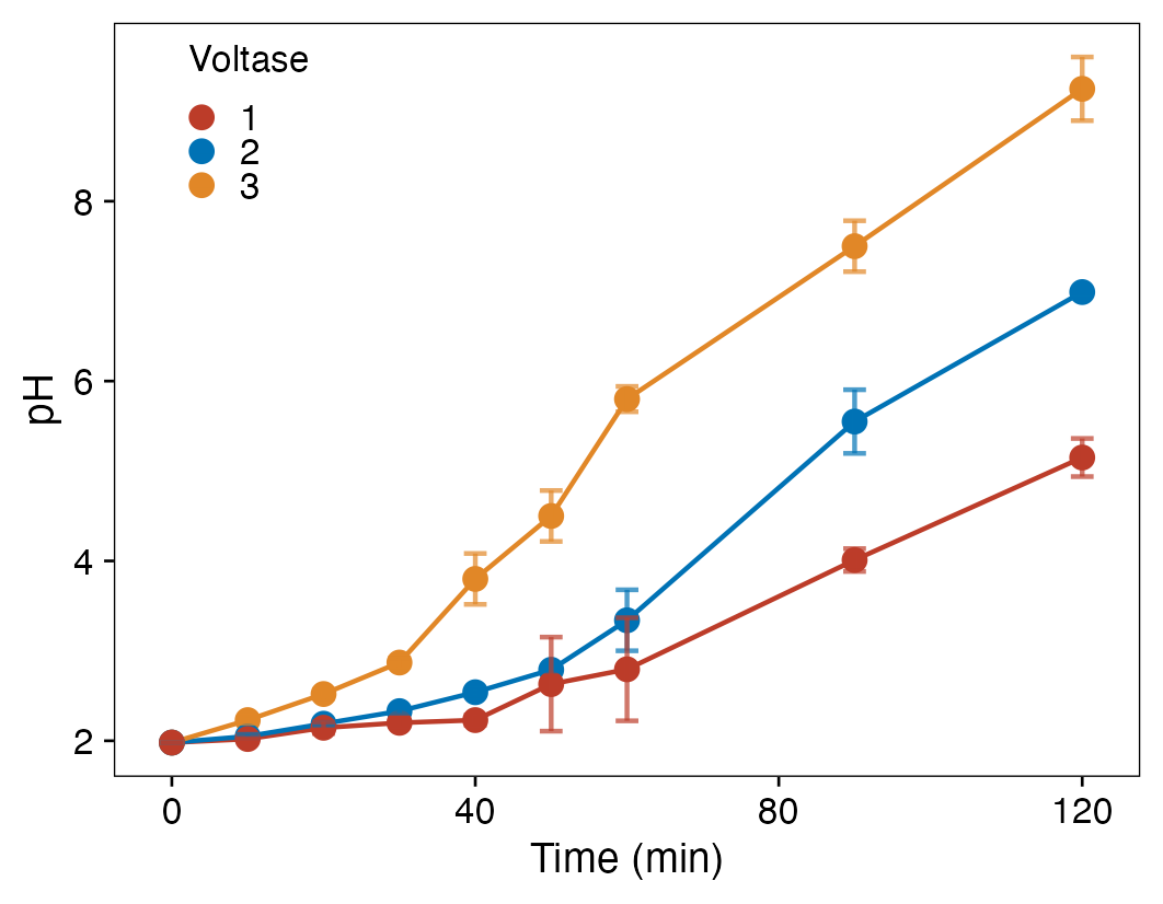 From an operational perspective, 3 V achieves a near-neutral to alkaline pH (pH ≥ 7) after 90 min, while 2 V requires longer contact time to approach neutrality, and 1 V may be insufficient for complete neutralization within the tested time. This indicates a trade-off between energy input (voltage) and treatment time [20,6]. The higher the voltage, the shorter the treatment time, but the higher the energy consumption.