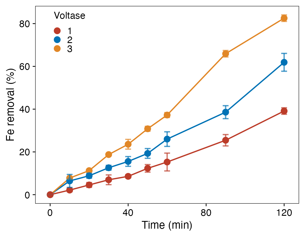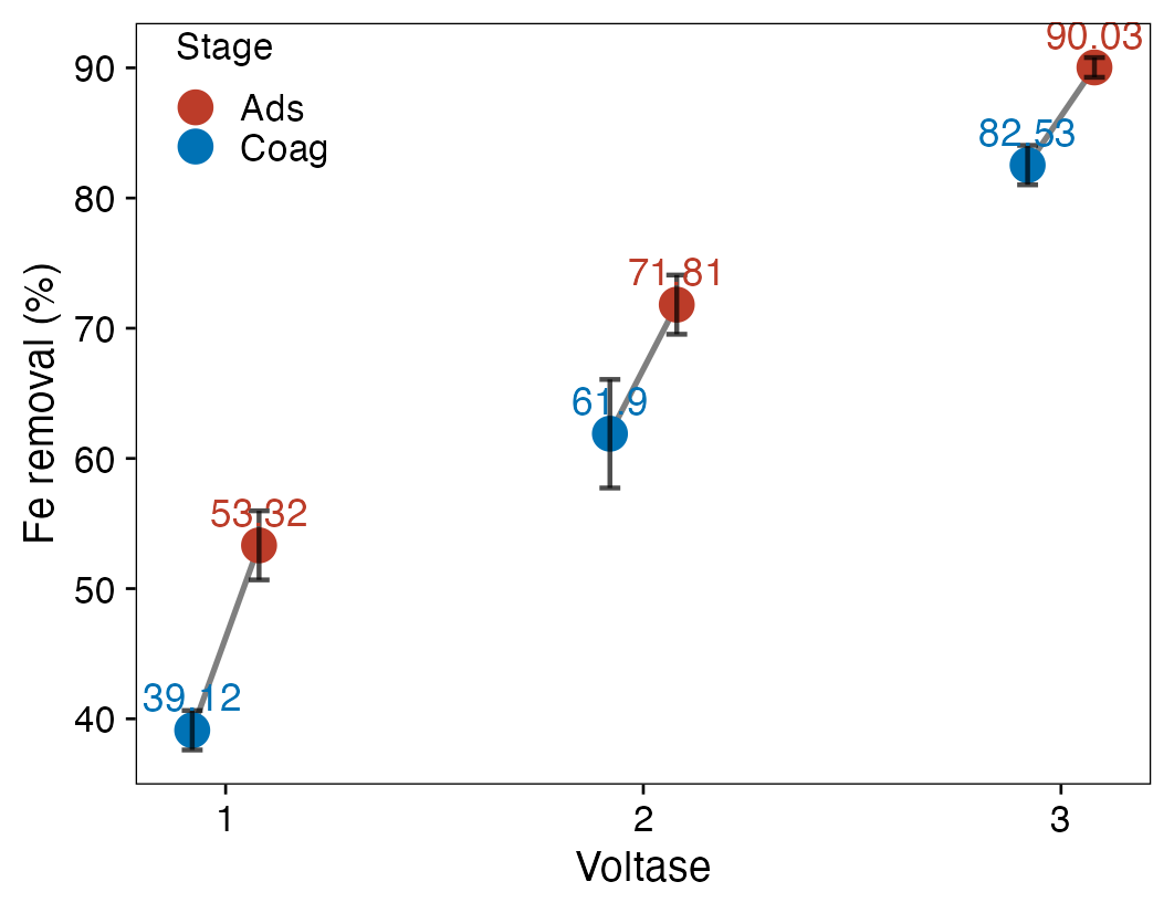The electrocoagulation experiments were conducted in batch mode under different voltages and contact times. The applied voltage was varied at 1, 2, and 3 V with contact times of 10, 20, 30, 40, 50, 60, 90, and 120 min. At each predetermined time, a sufficient sample volume was withdrawn for analysis. pH, TDS, and Fe concentration were measured to evaluate EC performance.