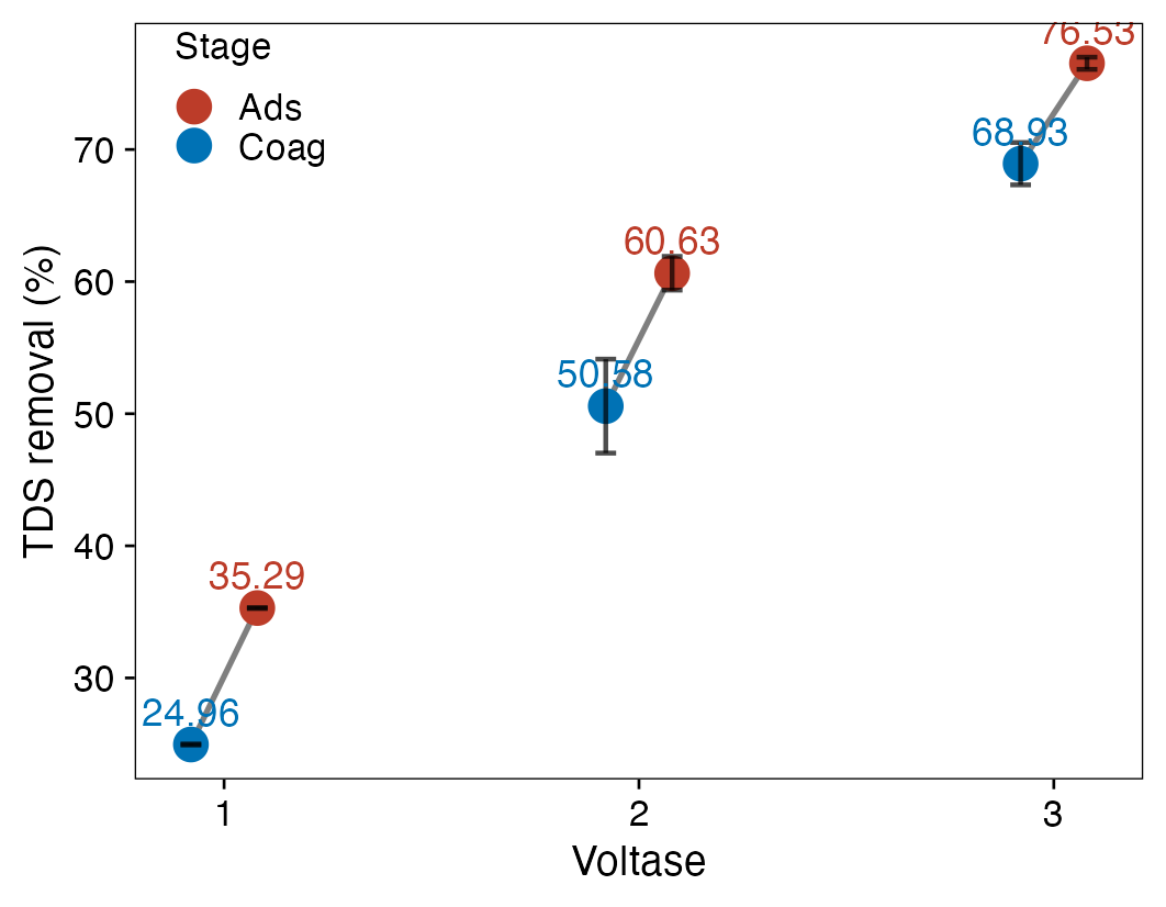From a practical perspective, the combined EC–adsorption system achieved 76.53% TDS removal under optimal conditions (post-3 V EC), representing a substantial reduction in dissolved solids. The neutral and acidic conditions yielded 60.63% and 35.29% removal, respectively, indicating that higher electrocoagulation voltage is essential to maximize both bulk and residual TDS removal.