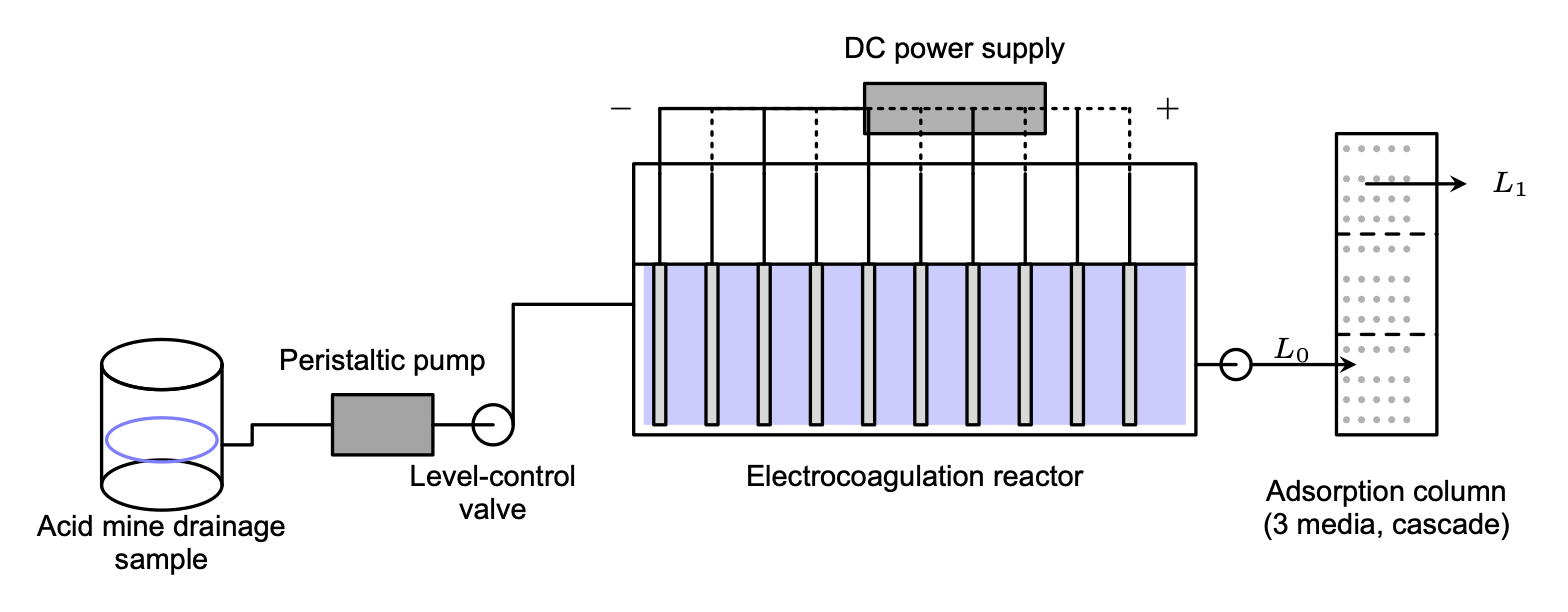 A schematic of the experimental setup is shown in Figure 1. AMD sample was pumped from a closed reservoir through a peristaltic pump and a level-control valve into the electrocoagulation reactor. The reactor contained ten parallel aluminum plate electrodes connected to a DC power supply in an alternating polarity arrangement. After the predetermined electrocoagulation contact time, the treated water exited the reactor and was passed through an adsorption column packed with three media (silica sand, activated carbon, and zeolite) in cascade before collection.