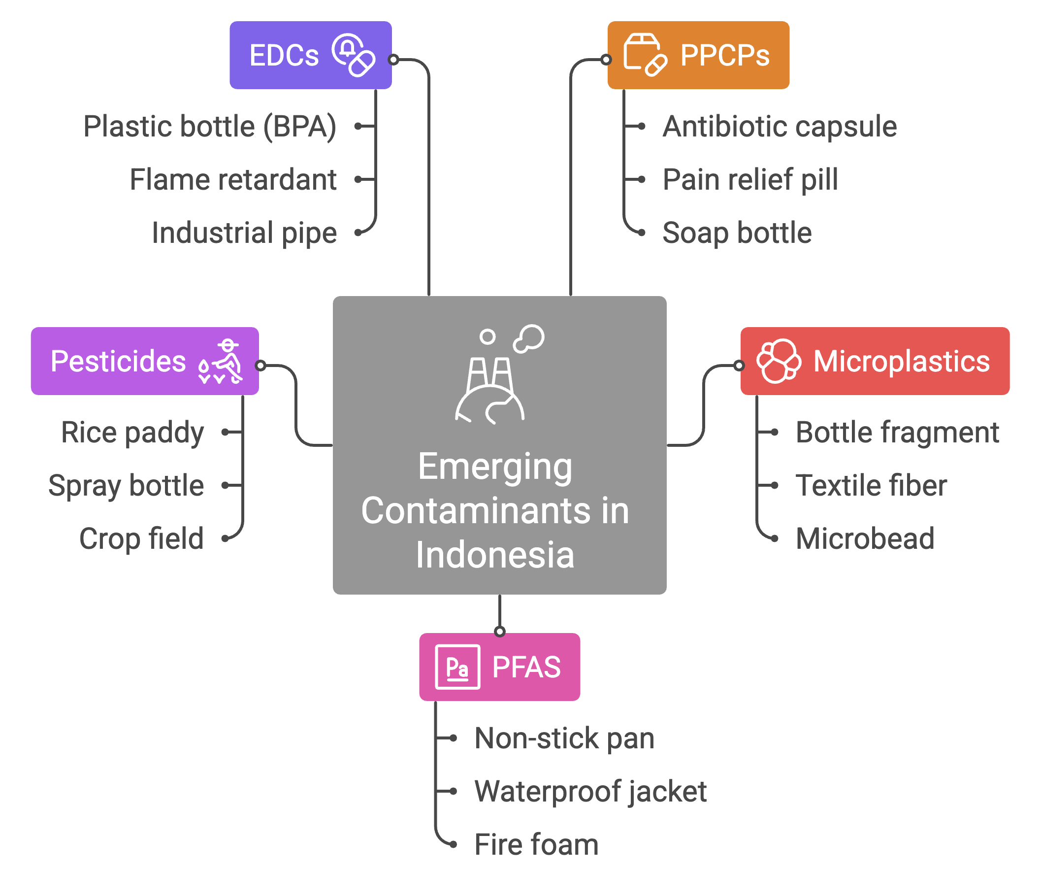 | PFAS | PFOS, PFOA, PFHxS, PFNA, PFHpA | Textile/leather manufacturing, food packaging, firefighting foams, consumer products | Jakarta Bay sediments, breast milk (Jakarta, Purwakarta), consumer products (clothing, packaging) |