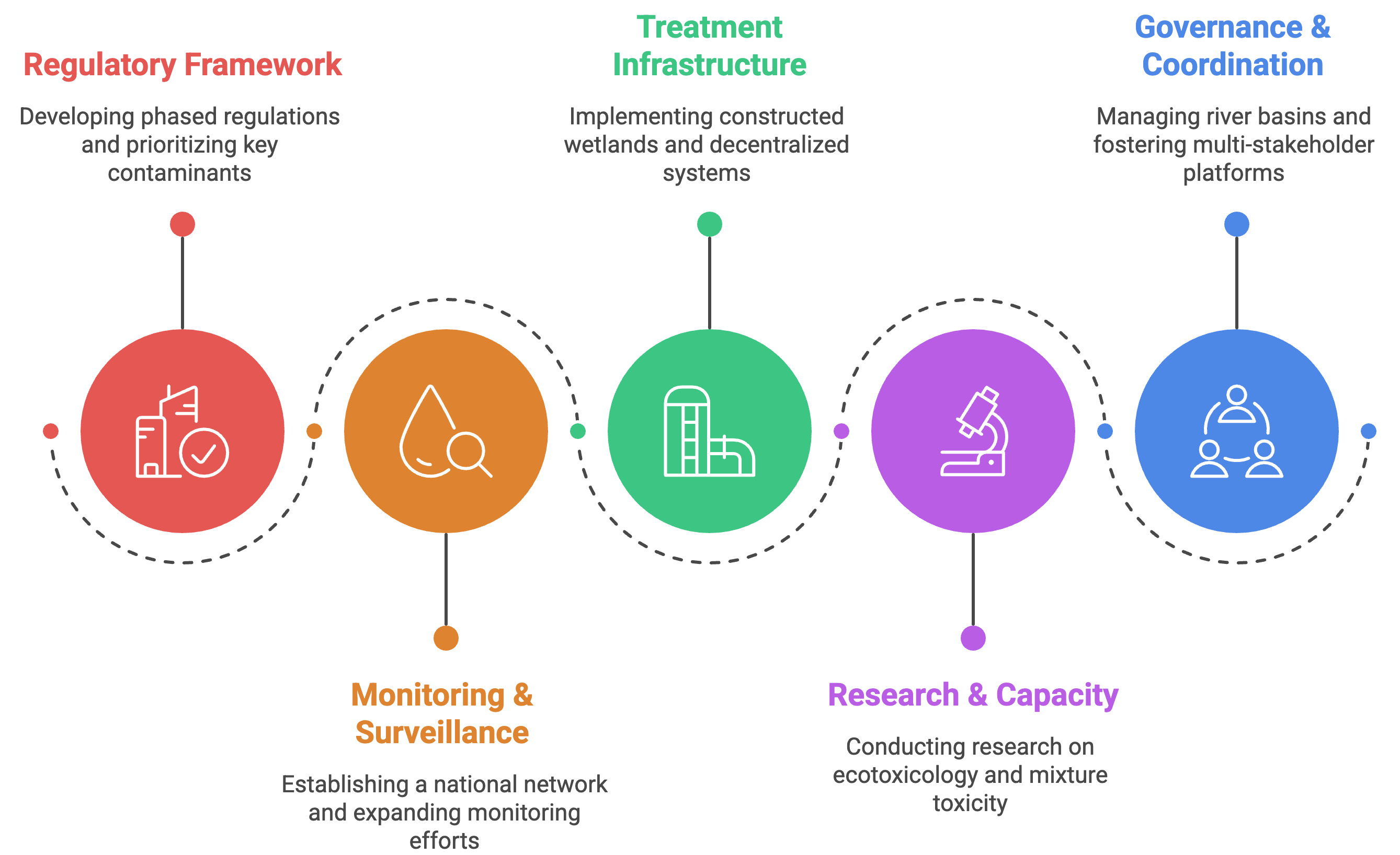 Effective management requires integrated action across multiple domains. Priority interventions include: (1) phased regulatory development beginning with well-documented priority substances such as antibiotics and PFAS; (2) establishment of national monitoring programs with strategic geographic coverage balancing intensity against resource constraints; (3) accelerated wastewater treatment infrastructure deployment emphasizing decentralized and nature-based solutions where appropriate; (4) targeted research addressing tropical-specific fate and effects, mixture toxicity, and locally-relevant exposure pathways; and (5) strengthened governance through improved inter-agency coordination, multi-stakeholder engagement, and evidence-based policymaking. Successfully addressing emerging contaminant pollution is essential for protecting Indonesia's exceptional aquatic biodiversity, safeguarding fisheries that provide protein to hundreds of millions, and achieving Sustainable Development Goals related to water, health, and environmental sustainability.